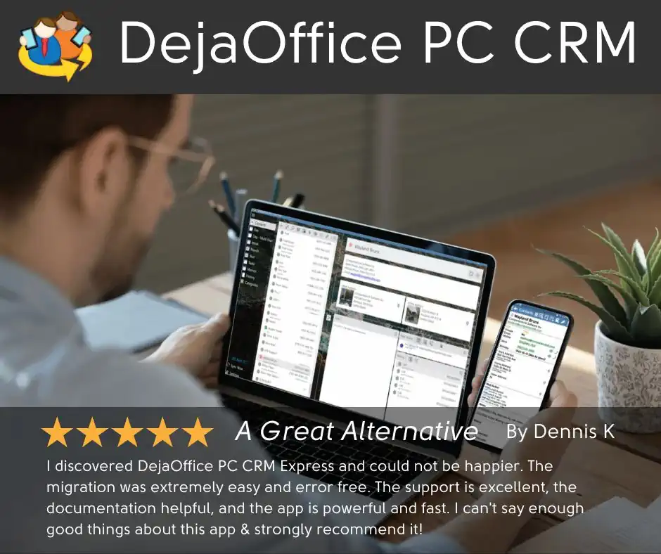 DejaOffice gives you the security and control of a full‑featured customer manager that stores data securely on your PC.